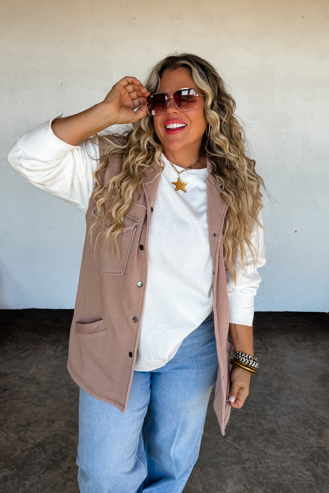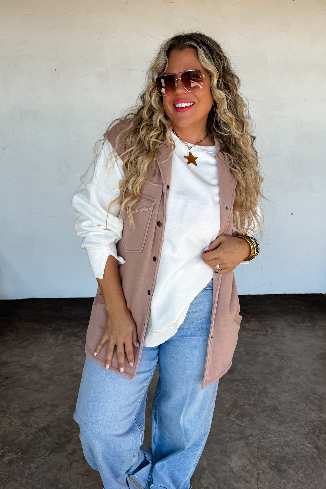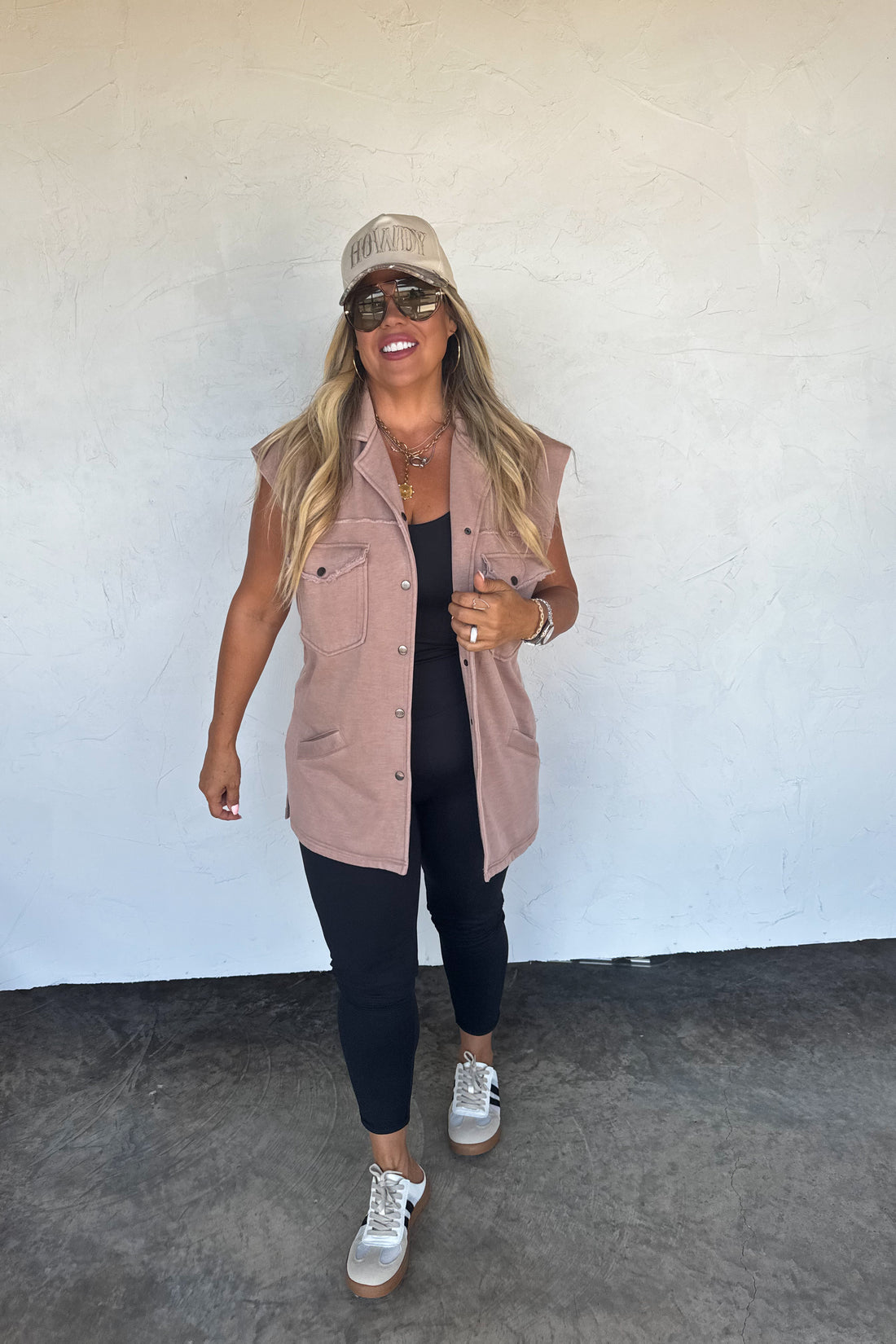 An easy, everyday layer with a relaxed fit and timeless utility style. The Hudson Utility Vest features a soft washed terry fabric, snap-button front with raw hem details, and functional front pockets. Designed in a neutral tone that pairs effortlessly with tees, sweaters, and denim for a laid-back, go-anywhere look.
